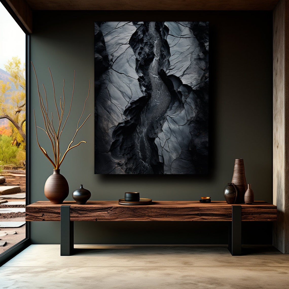 This abstract canvas painting captures the intricate details of rocks and cracked surfaces in stunning shades of black and gray. The dynamic composition draws the eye through its dark textures, creating a powerful visual contrast. This piece exudes a sense of depth and mystery, perfect for contemporary and industrial-style spaces. Available as Digital printing and Digital prints with brush strokes.