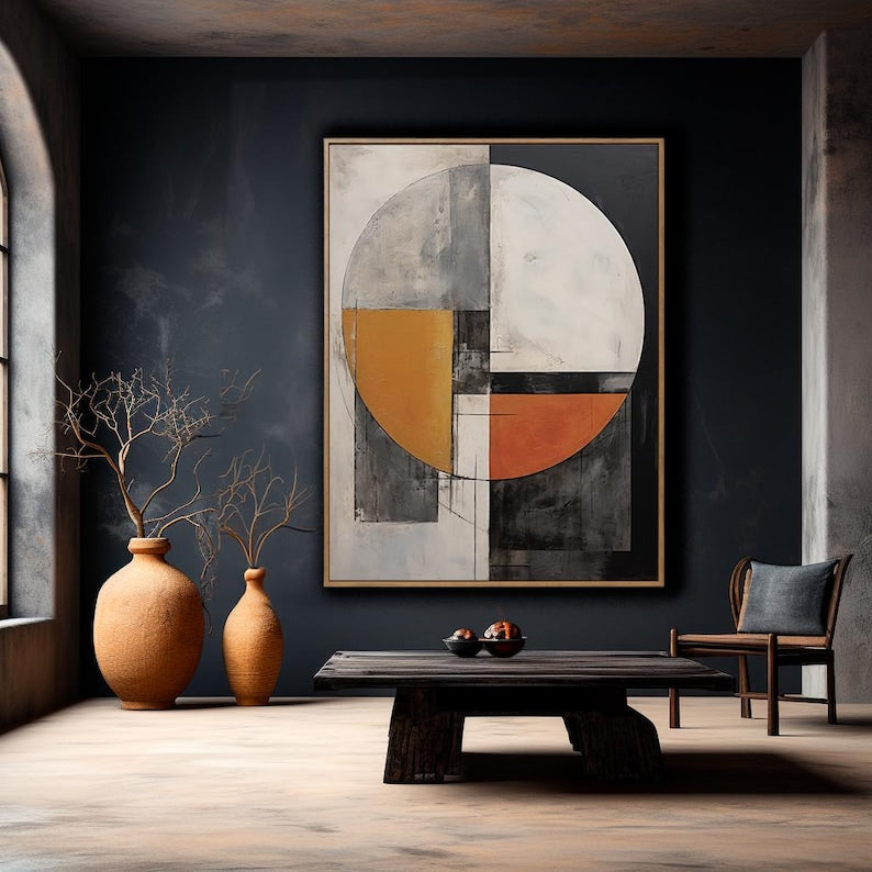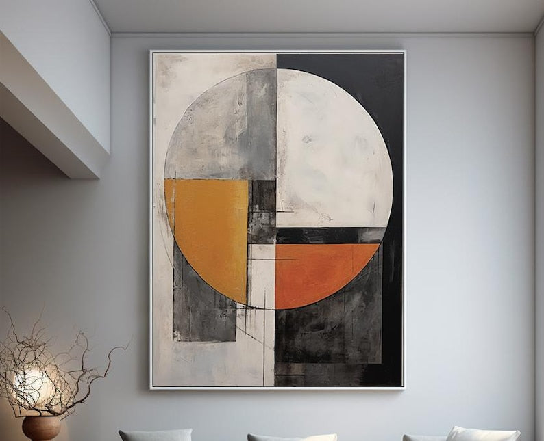 This striking canvas painting combines sharp geometric shapes and bold colors, featuring a large circle divided into sections of black, white, and orange with subtle texture. The vibrant orange and contrasting black tones bring depth and energy to the design, creating a visually captivating statement piece. Perfect for modern and contemporary spaces, this artwork adds a dynamic touch to any room. Available as Digital printing and Digital prints with brush strokes.
