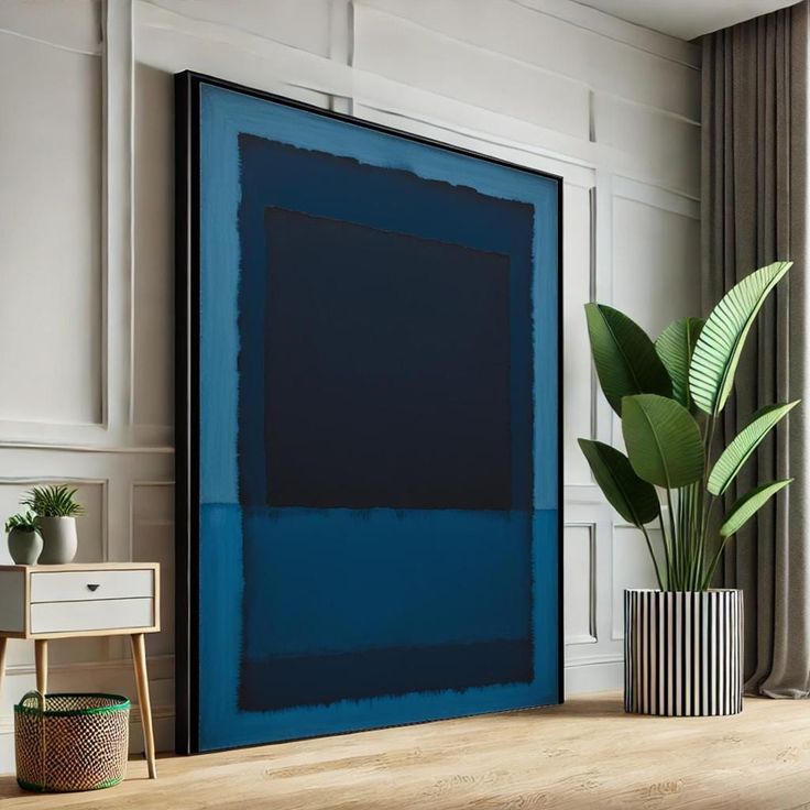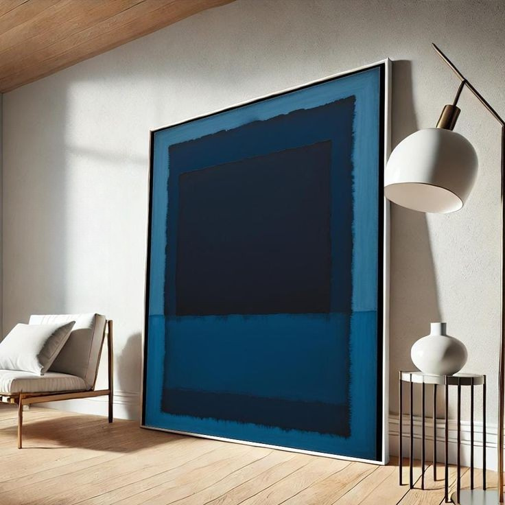 This stunning abstract canvas painting features rich, deep blue tones with dark edges that create a sense of depth and mystery. The bold, solid square form contrasts beautifully with the surrounding blended blue shades, offering a modern, minimalist aesthetic. The gradient effect and sharp edges of the shapes add structure, while the dark hues bring an element of tranquility and sophistication to any room. This hand-painted canvas artwork is perfect for contemporary spaces, including living rooms, offices, or art galleries, adding a striking focal point to your decor. Ideal for those looking to buy canvas paintings that add boldness and elegance to their interiors.