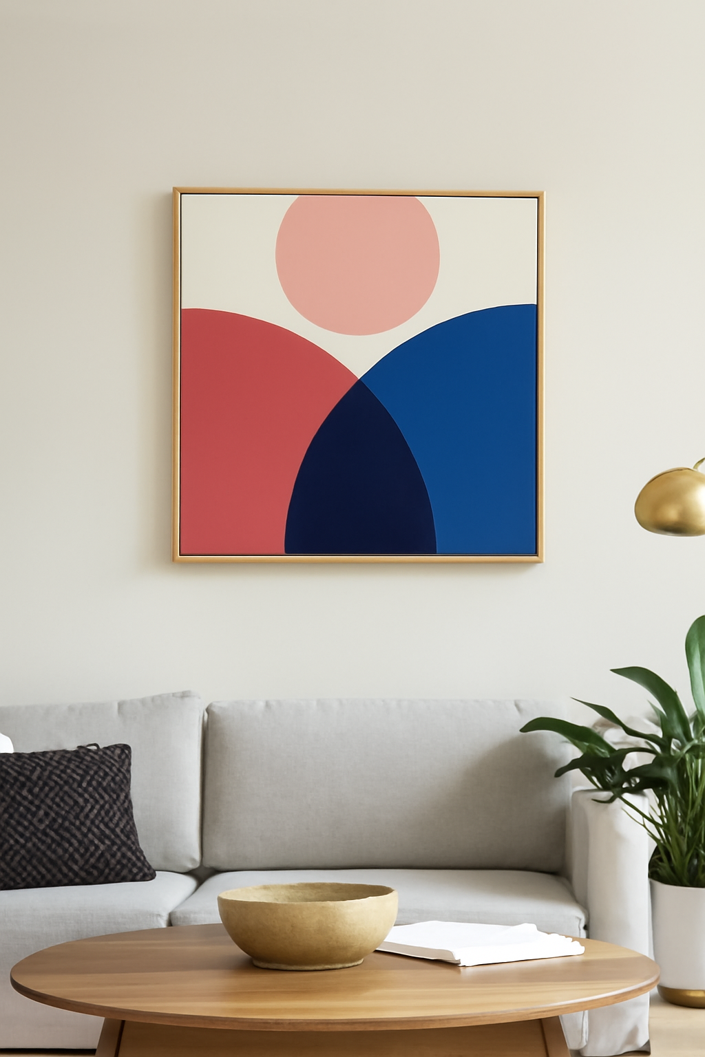 The Dual Rise Canvas Painting features a striking abstract composition with intersecting magenta and blue arches rising toward a soft pink circle. Set against a clean white background, the bold shapes and vibrant palette bring energy and clarity to modern decor. This canvas painting is ideal for minimalistic, geometric, or contemporary interiors. A great choice for anyone looking to buy canvas painting art that combines symmetry, color, and modern design.