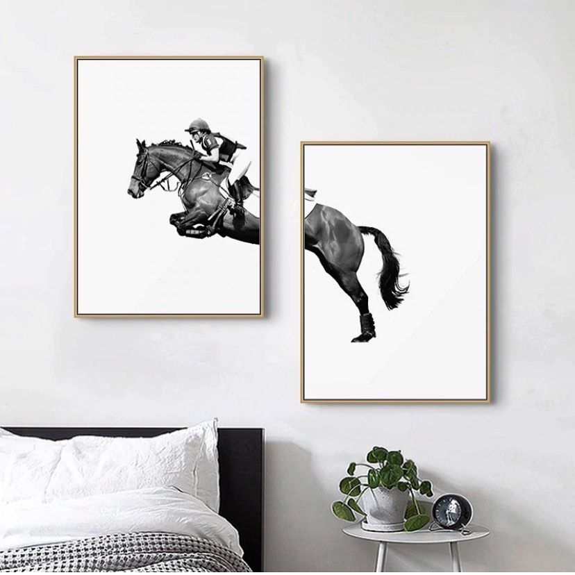 This striking equestrian canvas set showcases the dynamic motion of a horse and rider captured in black and white. The minimalist design emphasizes the elegance and power of equestrian sports, making it a perfect fit for modern decor. The artwork features graceful action and sharp contrasts, bringing energy and sophistication to any space. Whether placed in a living room, office, or study, this canvas set adds a unique and captivating touch to your interior. Available as hand-painted canvas or digital print, it enhances your space with timeless beauty.