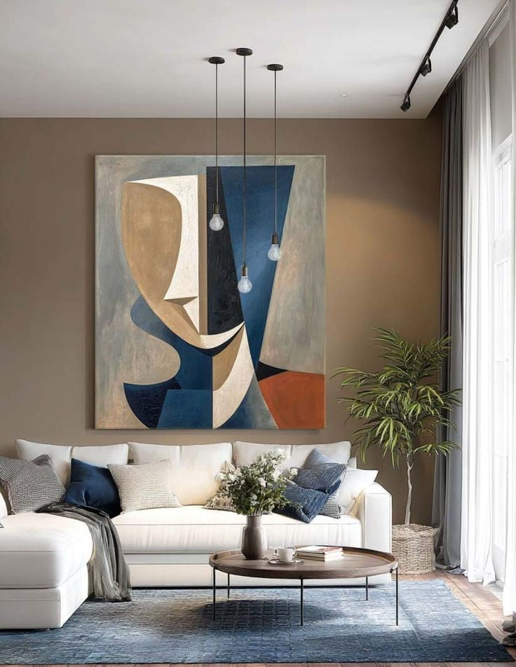 This Fragmented Face canvas painting blends abstract geometry with neutral tones of beige, navy blue, rust, and ivory. The face is broken into asymmetric shapes that echo Cubist influence, adding both mystery and elegance. Its bold composition becomes a conversation piece while still harmonizing with modern interiors. Whether in a living room, hallway, or office, this artwork uplifts spaces with a striking yet balanced aesthetic. Ideal for those who appreciate minimalist yet expressive decor, it effortlessly enhances modern decor themes.