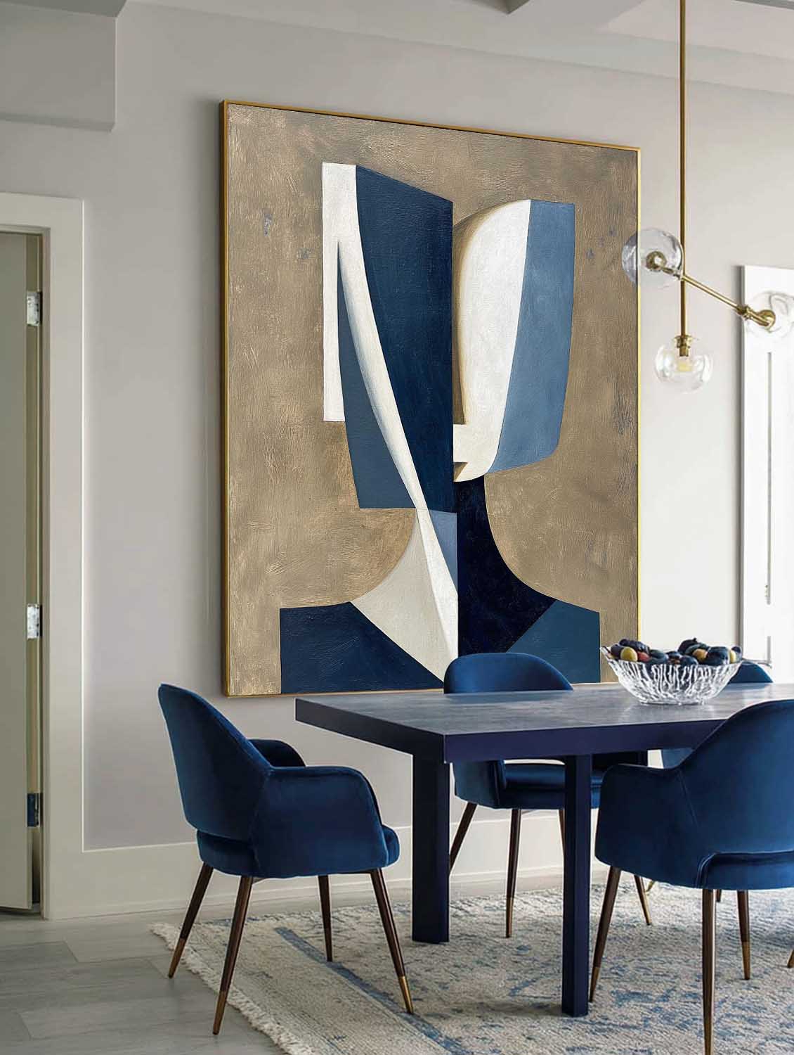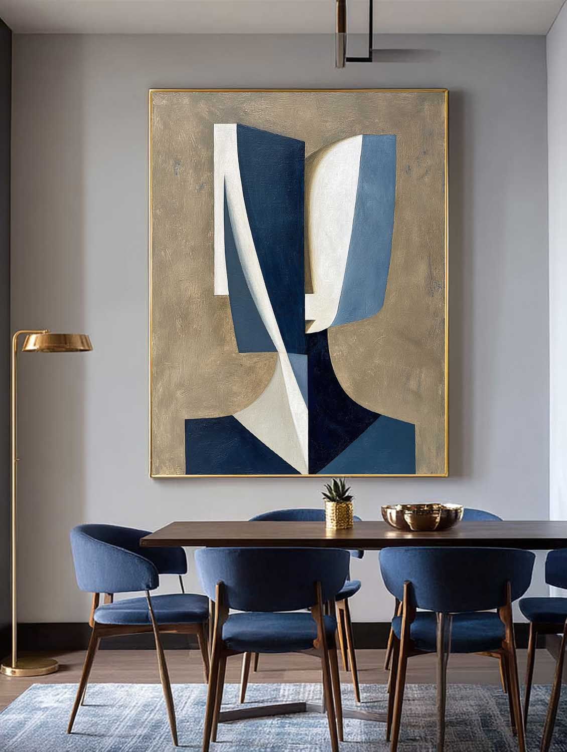This bold canvas painting showcases an abstract interpretation of human faces, utilizing strong geometric shapes in deep blues, whites, and warm beige tones. The angular forms and sharp lines create a modern, minimalist design that invites the viewer to interpret the piece in their own unique way. The combination of light and dark shades adds depth, while the clean composition exudes a sense of balance and sophistication. Available as hand-painted canvas, this artwork is an ideal choice for contemporary interiors, bringing a striking yet subtle artistic presence to any room.