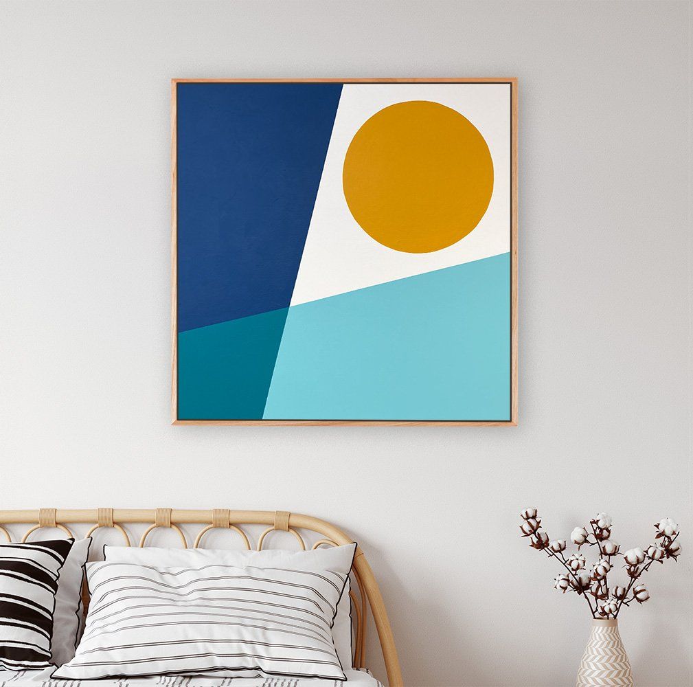 This Geometric Sun Canvas Painting features a bold design with vibrant blue, teal, and yellow hues. The bright, circular sun against the cool geometric shapes of blue and turquoise creates a stunning contrast, adding a dynamic yet balanced look to any room. Its minimalist approach, with simple, clean lines and a focus on bold color, makes it perfect for modern or contemporary interiors. Available as both a hand-painted canvas and digital print, this piece brings a sense of warmth and calm, transforming any space with its simplicity and vibrancy. Buy canvas painting to add a touch of modern elegance to your home or office.