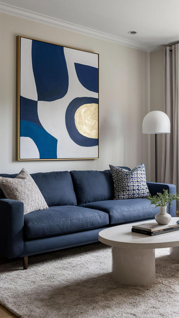 Golden Tide Canvas Painting features sweeping navy forms surrounding a luminous metallic gold circle, all set on a crisp white background. The contrast between the rich blue curves and textured gold center adds depth and modern elegance, making it ideal for modern interiors with a bold artistic sensibility. Perfect for living rooms, lounges, or entryways, this canvas painting delivers a polished yet dynamic look. A refined choice to buy canvas painting that combines abstract fluidity with luxurious detail for upscale modern decor.