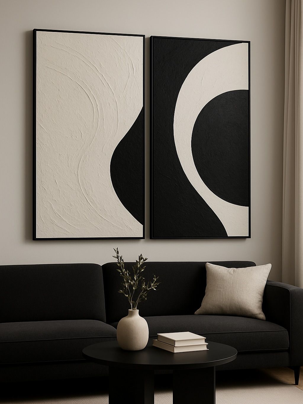 This elegant canvas painting set features two complementary black-and-white abstract pieces, each showcasing smooth flowing curves and subtle textured surfaces. The minimal palette and clean shapes create a refined balance, making the set a perfect focal point for modern interiors, living rooms, and contemporary minimalist spaces. The contrasting yet harmonious designs add sophistication, calm, and visual rhythm—ideal for anyone looking to buy canvas painting that enhances their decor with timeless monochrome style.