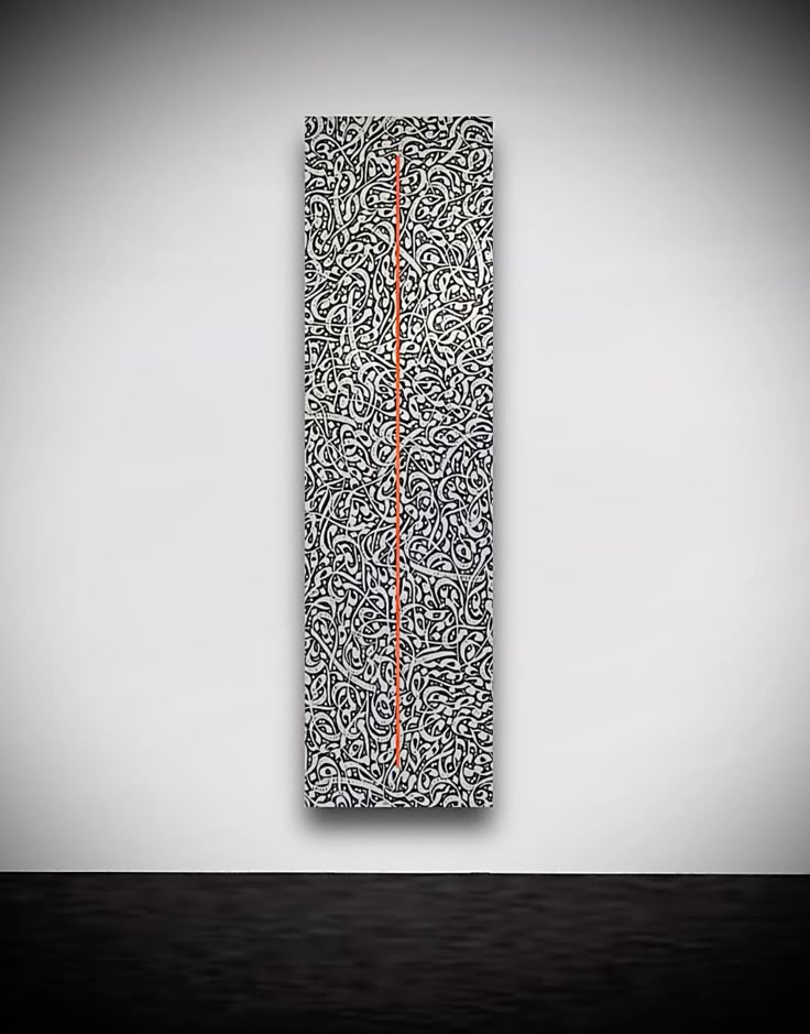 This bold hand-painted canvas features intricate Arabic calligraphy in black and white, with a striking red accent running through the center. The delicate swirls of calligraphy create a harmonious flow, with the bold red line adding a modern touch and serving as a visual focal point. The minimalist color palette enhances the elegance of the piece, making it a perfect blend of traditional Arabic calligraphy and contemporary art. Ideal for contemporary homes, offices, or creative spaces, this artwork brings both sophistication and energy to your decor.