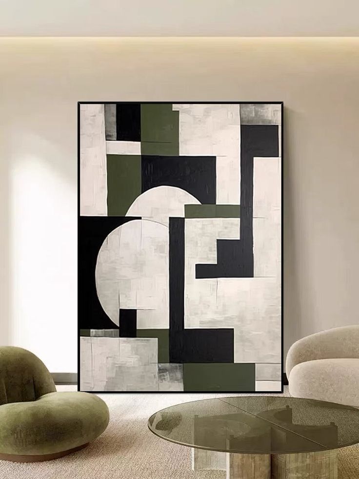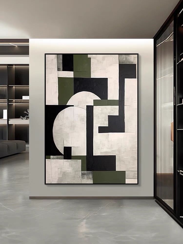 Olive Geometry Canvas Painting features a bold interplay of geometric forms in black, olive green, and soft white tones. With overlapping rectangles, sharp edges, and circular breaks, this structured composition adds a touch of architectural rhythm to modern interiors. It’s ideal for spaces that value balance, symmetry, and contemporary design. This canvas painting is a strong visual anchor for entryways, workspaces, or lounge areas. A stylish option to buy canvas painting that combines abstract art with modern industrial flair.
