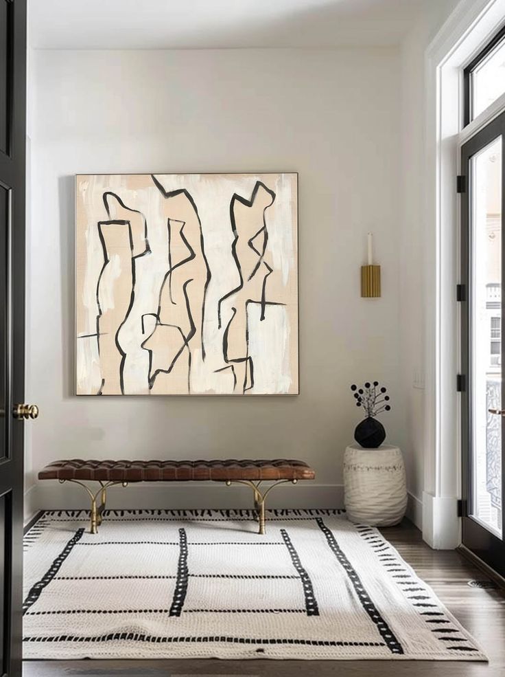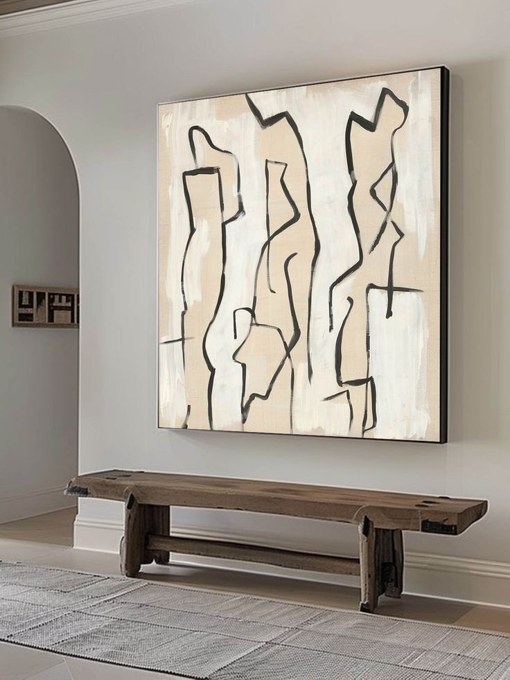 This striking canvas painting showcases fluid, abstract lines in black, gently flowing across a soft beige background. The minimalist design evokes a sense of movement and structure, with each curved and intersecting line forming an intriguing sculptural composition. The interplay of light and dark elements creates a dynamic visual contrast, adding depth and sophistication to any modern space. Perfect for contemporary interiors, this hand-painted canvas artwork brings a touch of elegance and simplicity to your home or office, effortlessly enhancing the overall decor.