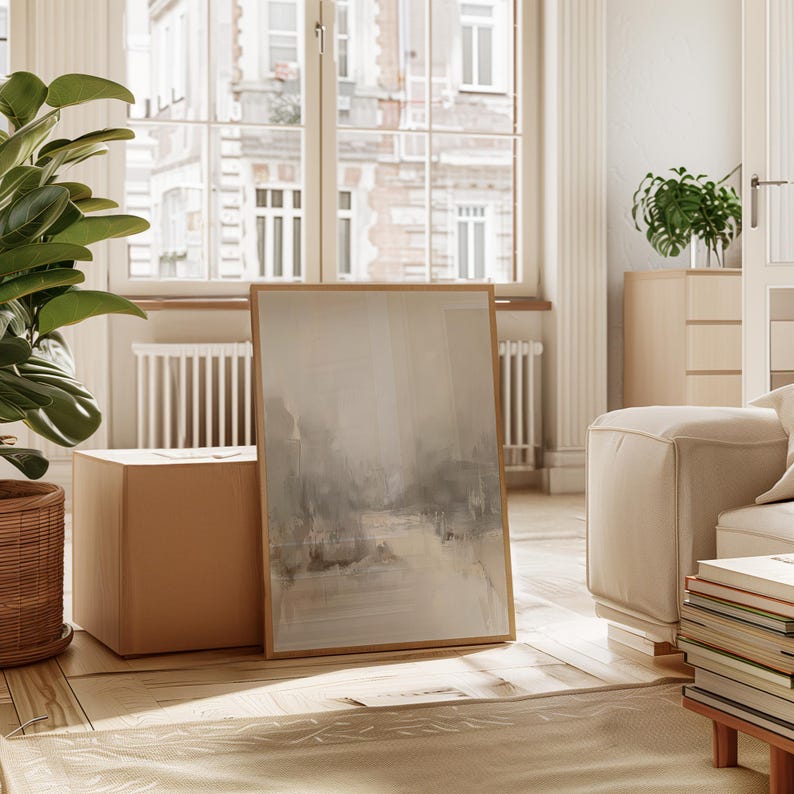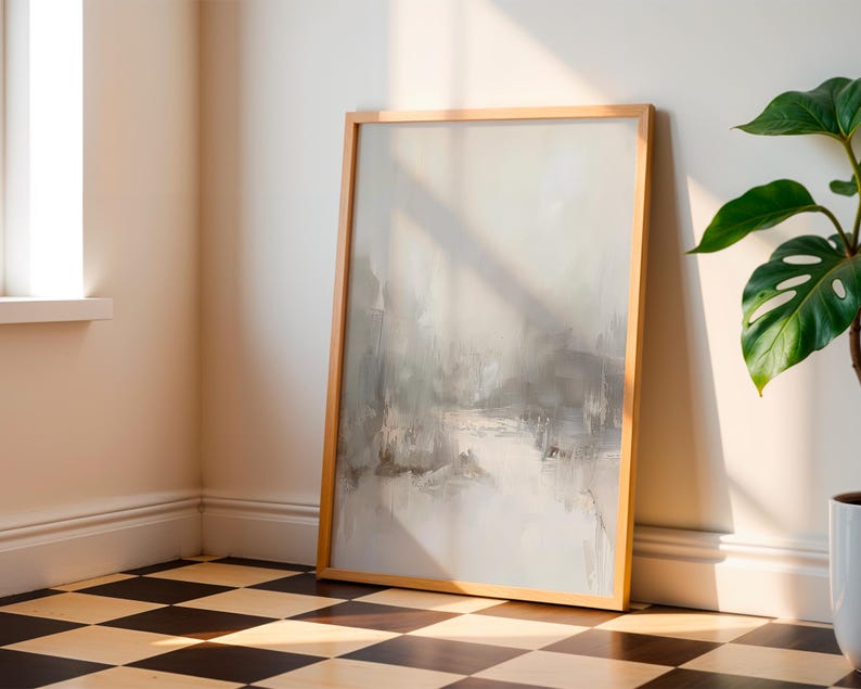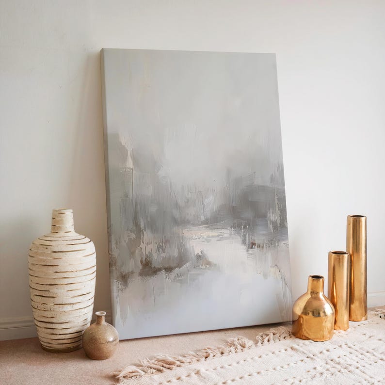 This serene canvas painting features a delicate blend of soft gray and beige tones, creating a peaceful and minimalist aesthetic. The smooth, fluid brushstrokes bring depth and subtle texture to the design, making it an ideal piece for modern or contemporary spaces. Its calming color palette enhances the tranquil atmosphere of any room. Available as Digital printing and Digital prints with brush strokes.