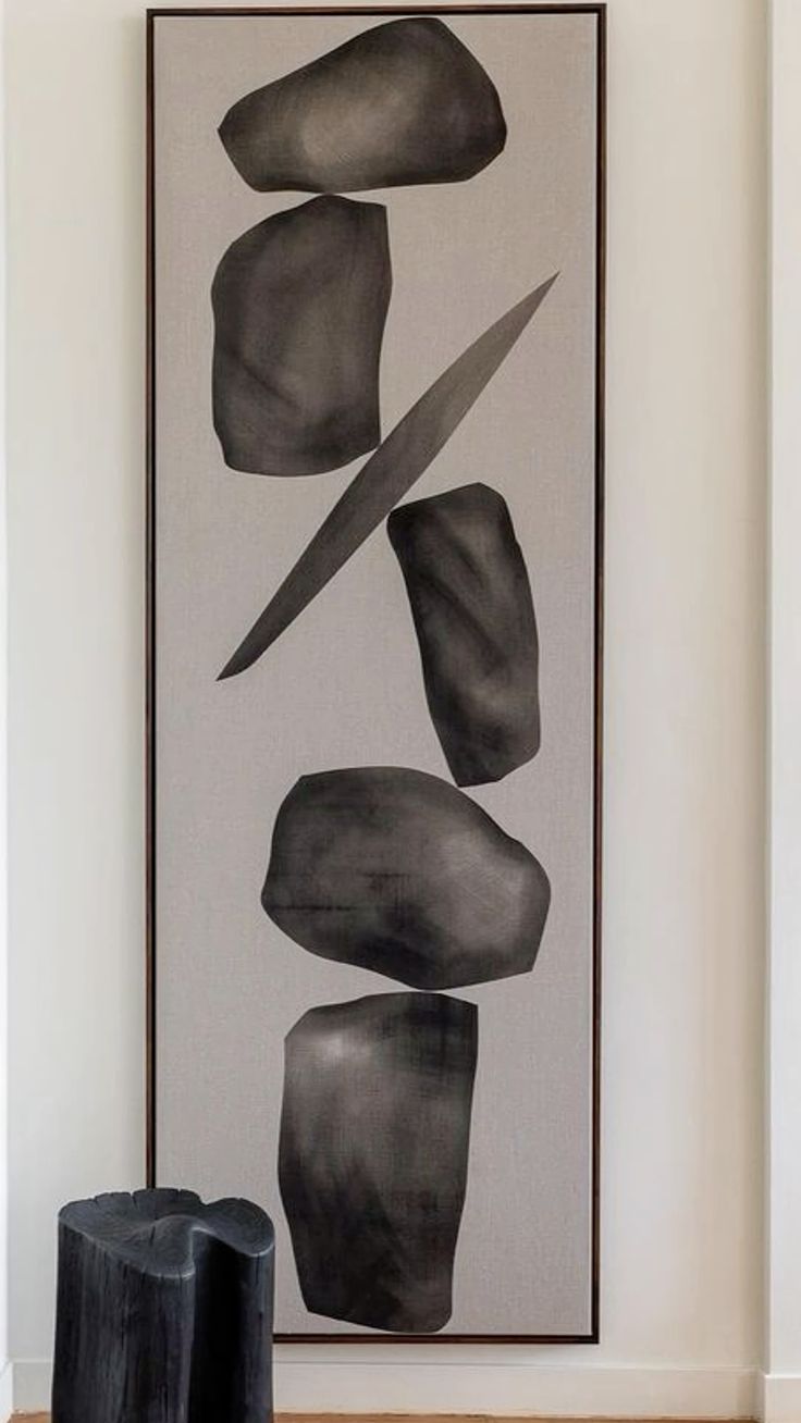 A striking piece of minimal elegance, Stone Flow Canvas Painting features soft, abstract stone-like forms in charcoal black, arranged on a neutral beige background. Each shape carries a meditative texture, while a diagonal slash adds depth and movement. Perfect for minimalist spaces, this canvas painting enhances neutral decor with quiet sophistication. Whether you're looking to buy canvas painting or elevate your wall with modern decor, this piece is a timeless choice. Available as hand-painted canvas.
