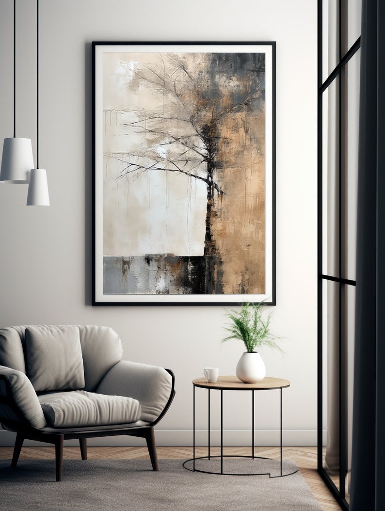 This serene canvas painting features a lone tree standing against a softly textured background of warm beige, black, and subtle grays. The delicate branches and abstract style evoke a sense of calm and tranquility, making it an ideal piece for any space that needs a touch of nature-inspired elegance. Available as Digital printing and Digital prints with brush strokes.