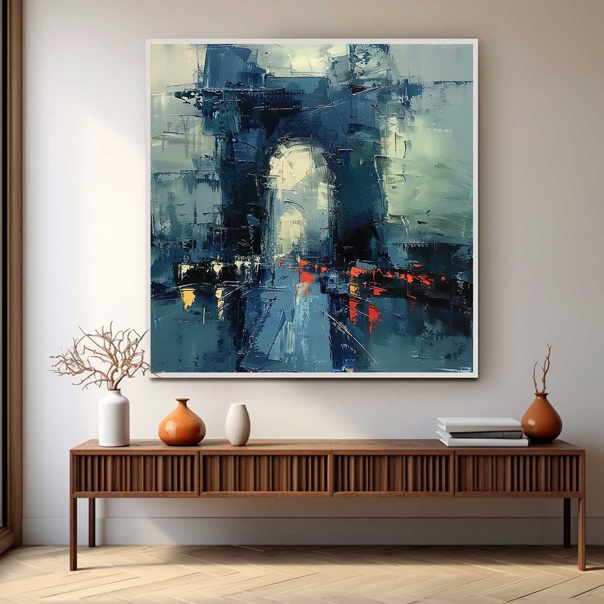 This captivating Urban Nights canvas painting brings to life the mysterious ambiance of a city at night. Featuring an abstract interpretation of an iconic archway, the artwork is infused with deep blue tones, evoking a sense of calm and reflection. The contrast of vivid red and yellow light splashes suggests the motion and vibrancy of city life, while the blurred, impressionistic brushstrokes create a feeling of dynamic movement. The bold use of color and texture adds both depth and energy, making it a perfect addition to modern or contemporary spaces. Whether in a living room, office, or hallway, this hand-painted canvas piece enhances any interior with its modern, urban charm.