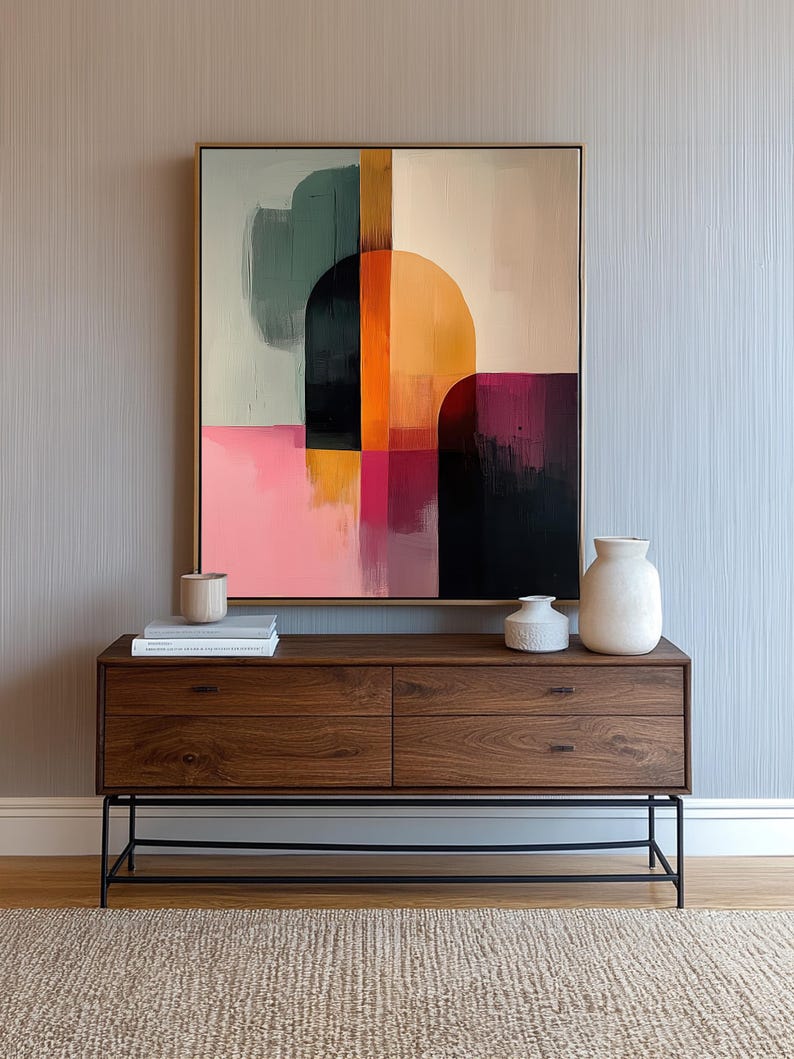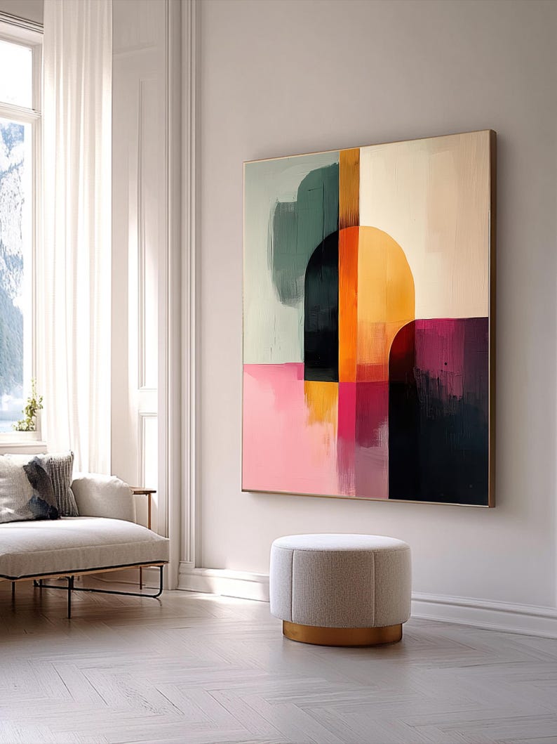 This dynamic canvas painting features bold, abstract geometric shapes in rich tones of orange, pink, black, and soft green. The interplay of soft curves and sharp edges creates a sense of movement and energy, making it a perfect statement piece for modern interiors. The warm orange contrasts beautifully with the cool greens and deep blacks, while the pink adds a playful yet sophisticated touch to the composition. Whether displayed in a living room, bedroom, or office, this hand-painted canvas brings a burst of color and contemporary flair to your space. Ideal for those who love modern art, this painting elevates any room with its vibrant hues and artistic expression.