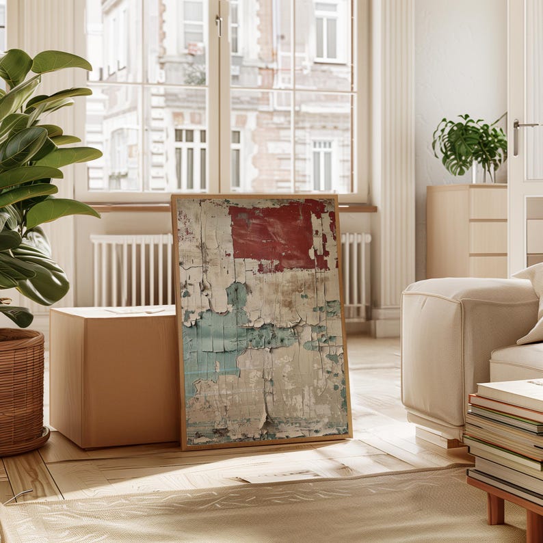 This striking canvas painting captures the beauty of aged, peeling paint in layers of deep red, faded teal, and neutral beige. The distressed texture evokes a sense of time and history, making it an intriguing piece for any room. Its rough and textured surface adds a unique, industrial vibe, perfect for modern, urban, or rustic interiors. Available as Digital printing and Digital prints with brush strokes.
